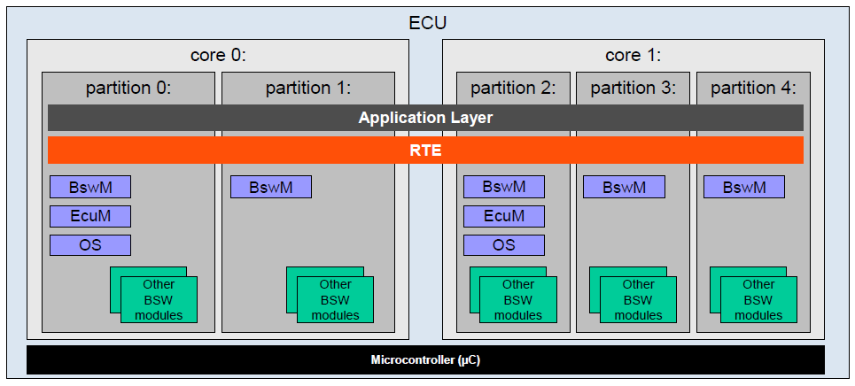 - BSW 모듈은 여러 파티션과 코어에 걸쳐 배포될 수 있다. 모든 파티션은 동일한 코드를 공유합니다.